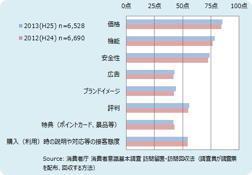 2012年(H24)から2013年(H25)の動きでは、概ね同程度と言える。経年で追う必要があるが、女性の就業率の上昇、専門職業への従事などで、職場で仕事上の評価をしたり、評価されたりするなどの機会が増加し、インターネットによる情報の入手などが加わり、意識や評価軸に変化があってもおかしくはない。女性への広告でもイメージ戦略のみならず、機能評価ができるような情報の提供方法もあるだろう。