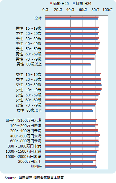 概ね、男女ともに50代以下で価格に対する点数が高い。若い世代は給与にまだ余裕がなく、中高年世代は家計が重荷となる。子供が独立した60代以降の方が、むしろ価格についてはこだわりがない。