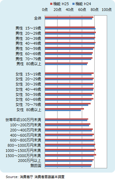 男性では10代から40代までが商品やサービスの機能に対する意識が高い。女性もほぼ同様だが、10代と高齢者(70代以上)で、男性よりもやや点数が下がる傾向がある。