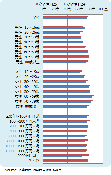 男性では安全性を意識するという点数が、全体として40代以上から高くなり、70代がピークとなる。女性もほぼ同様だが、男性よりも全般的に点数が高く、より安全性を重視している。
