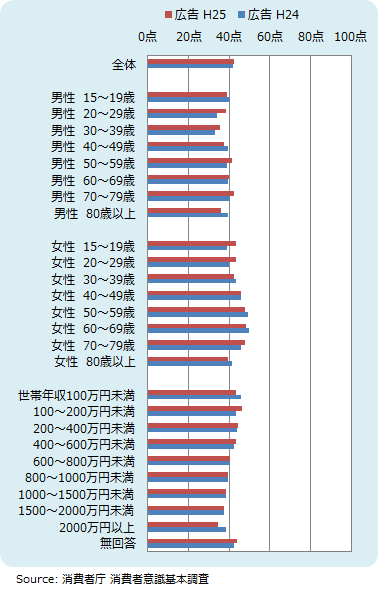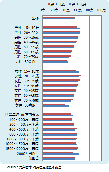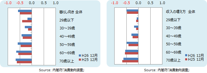 年代の高い層ほどより厳しく見ており、2013年(H25)と2014年(H26)の比較では、2014年の方がマイナス度が強まっている。収入が伸びず、消費税などの負担が増し、それでも家族を養っていかなければならない40代や、老後資金について気になりはじめる50代、実際に年金の減少などを受け、不安を感じる60代以降など、消費者意識としてはネガティブ度が強い。