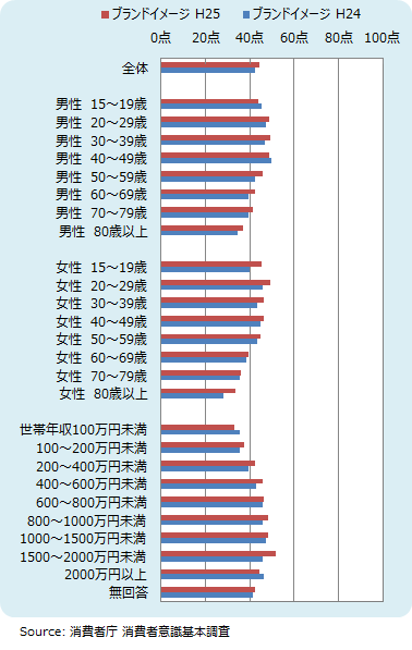 ブランドイメージについては、男性では20代から40代、女性では20代から50代での点数が高い。男女ともに10代もけっして低いとは言えず、若い世代からブランドとして認識してもらうコミュニケーションは重要である。