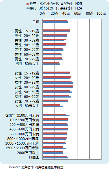 全般的に、女性の方が特典を気にする傾向がうかがえる。男性は若い年代ほど点数が高くなり、10代がピークとなる。女性は、10代も高いが、20代、30代とさらに点数が上昇し、もっとも高いのは40代である。