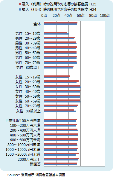 接客態度については、男女ともに10代と80歳前後の高齢者を除くと、20代がやや低いものの年代間での点数差は少ない結果となった。男女では女性の点数が高い。