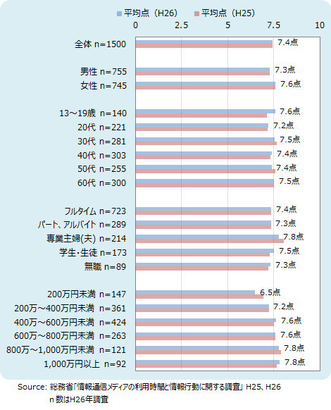 全体で7.4点、2013年(H25)と2014年(H26)で点数の差はほとんどない。男性と女性では女性の方がやや点数が高く、年齢別では、2013年は30代がもっとも高かったが、2014年は10代が抜いた。50代や60代も点数は高く、全体として年代での大きな違いはなく、それぞれのライフステージに満足していると見ることができる。