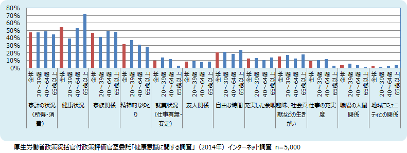 高齢化社会を意識し、また収入が期待できないとなると健康が資産として重視される。幸福感の重視事項として、「健康状況」(54.6%)を挙げる回答が40代以上で高く、「家計の状況」の回答率を超えている。