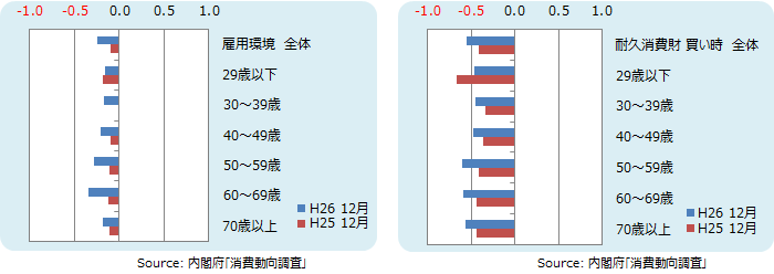 雇用環境と耐久消費財の買い時については、年代間で大きな差はないが、雇用環境について2013年(H25)より2014年(H26)の方がマイナス率の幅が広がっており、高齢者ほどその傾向が強い。耐久財の買い時について29歳以下はマイナス得点が2014(H26)に比較しやや縮小したが、点数としてはまだマイナスが大きいので消費がすぐに期待できるものではないだろう。