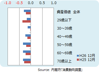 「資産価値」については、20代以下の若い世代で点数のマイナスが高く、40代以降は年代の高まりとともにマイナスの点数が上昇する。20代以下を除き、どの年代でも、2013(H25)より2014年(H26)の方がマイナス評価が増えている。